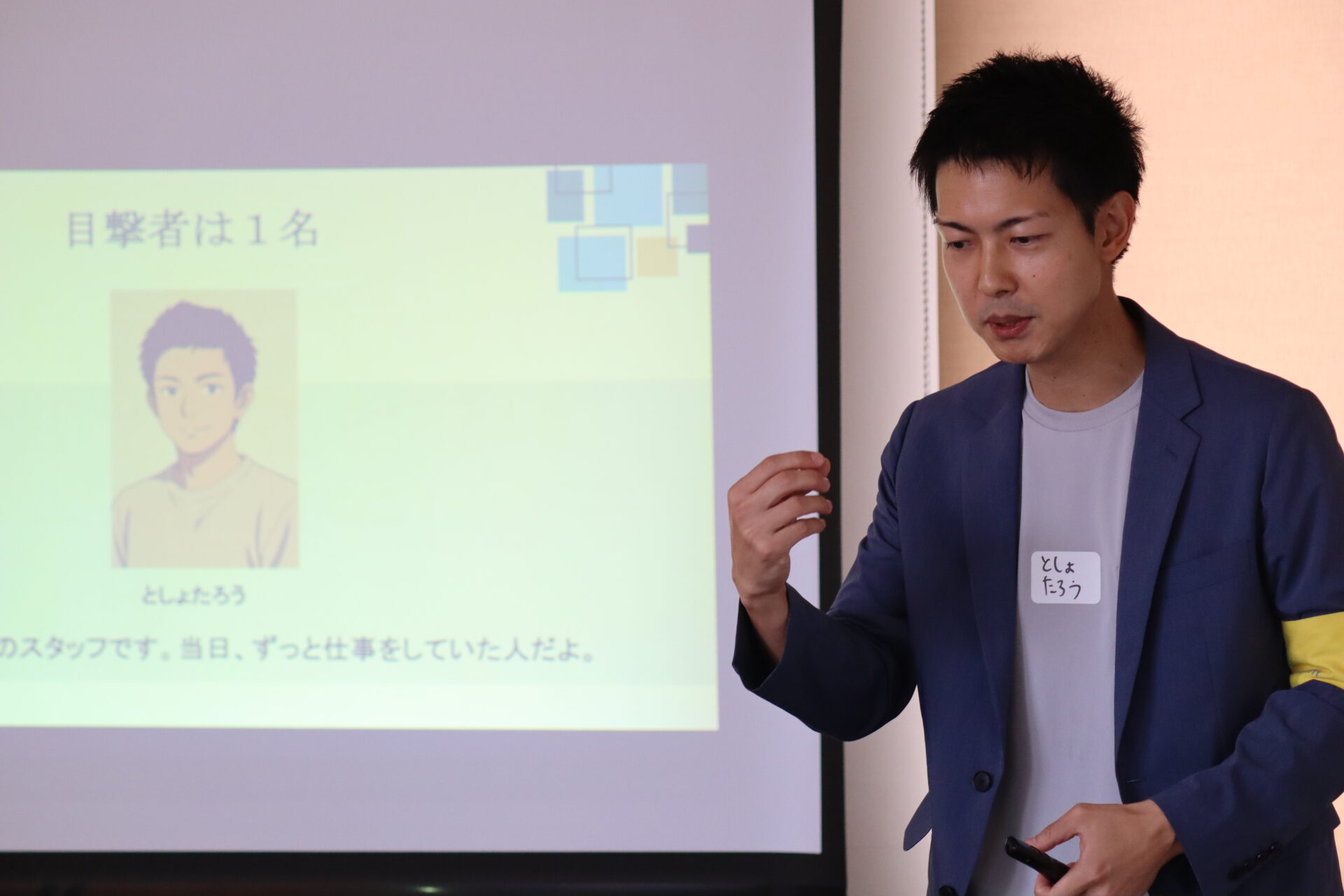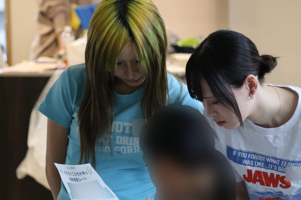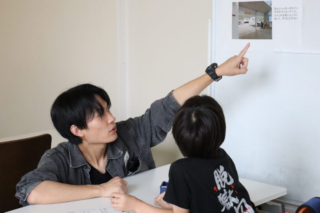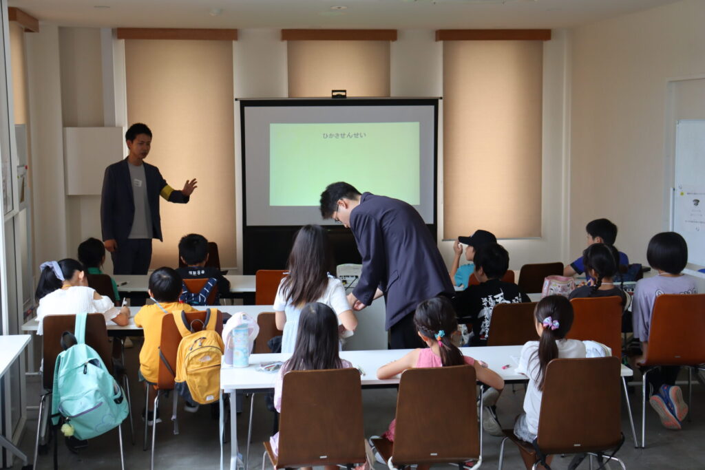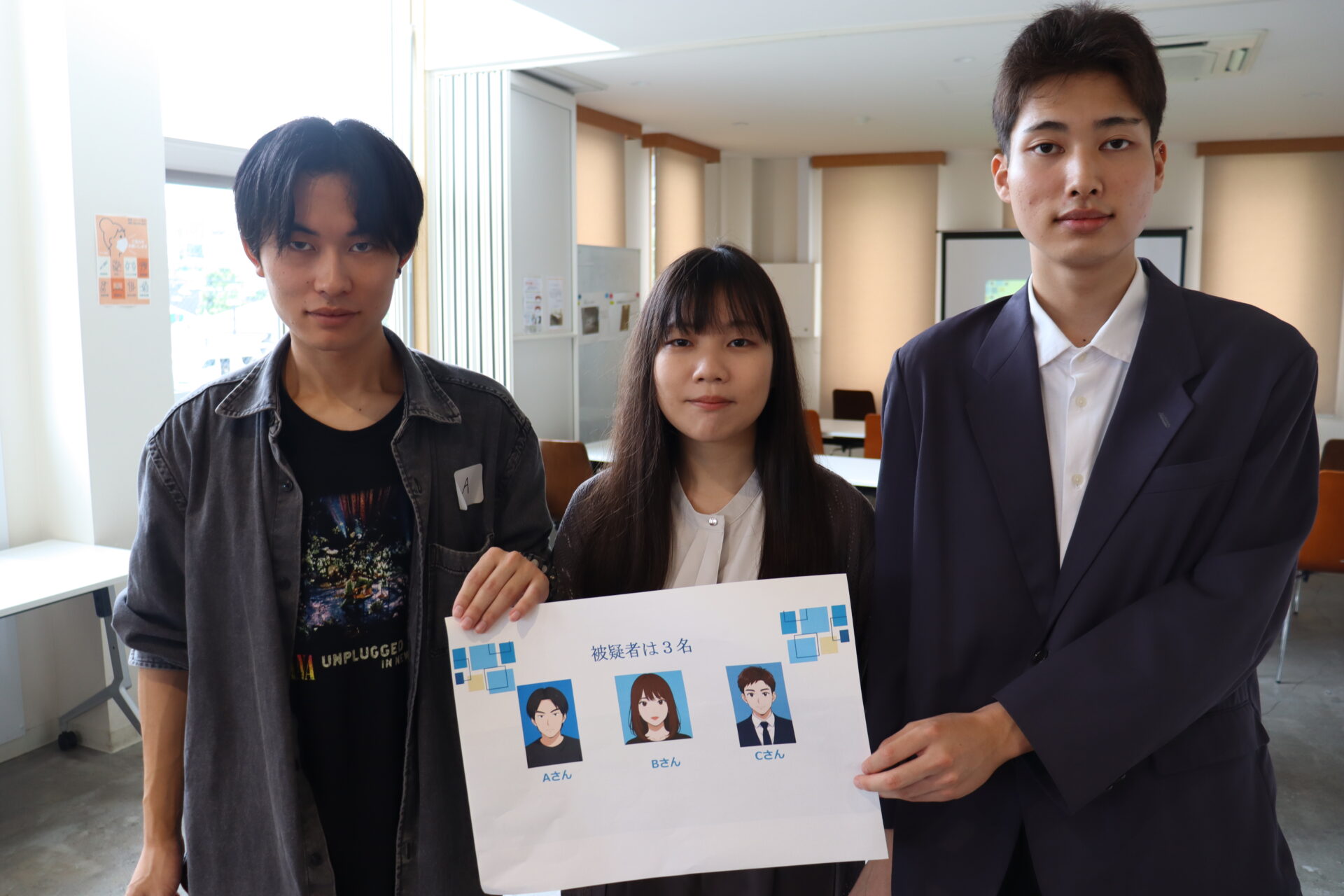 また、学生達はアドバイスや助言のほか、早く着いた子どもと小学校での流行りの話をするなど子ども達と積極的にコミュニケーションを取り、被疑者に扮した3人はスライド写真の画像に服装や髪型を似せ、それぞれの名演で会場を盛り上げました。