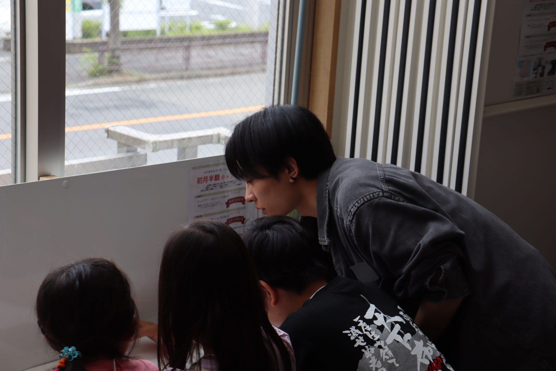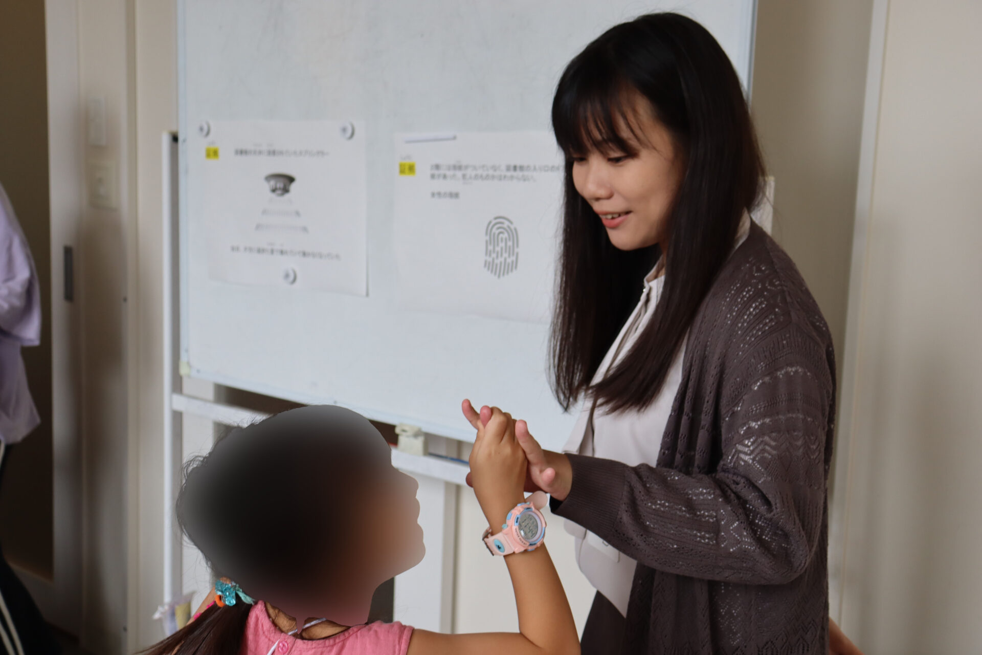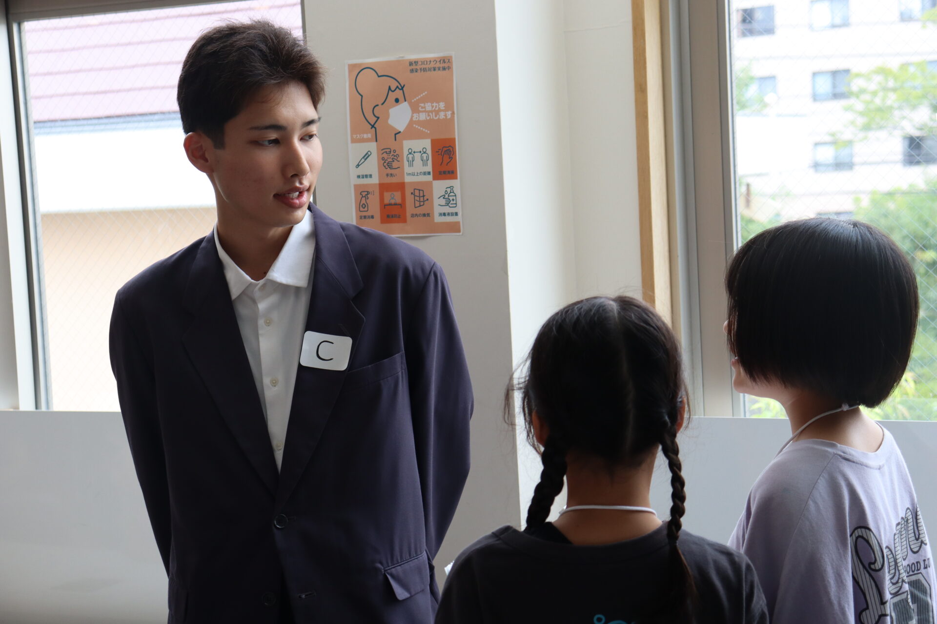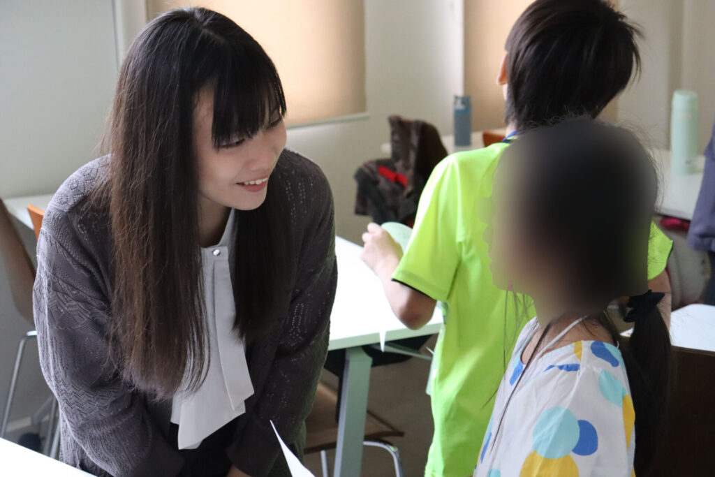また、学生達はアドバイスや助言のほか、早く着いた子どもと小学校での流行りの話をするなど子ども達と積極的にコミュニケーションを取り、被疑者に扮した3人はスライド写真の画像に服装や髪型を似せ、それぞれの名演で会場を盛り上げました。