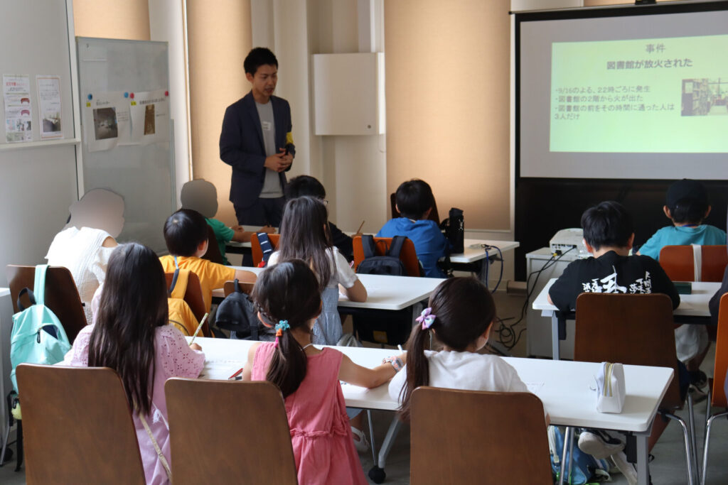 犯罪が発生すると捜査が開始され、事件の概要や犯人の特徴等を事情聴取したり、犯人に関する証拠品を押収したり、現場検証が行われます。講義では、参加した子ども達が警察官となって、現場での証拠と目撃情報をもとに3人の被疑者から犯人を特定することで犯罪立証と犯人特定の手法を体験してもらうものです。