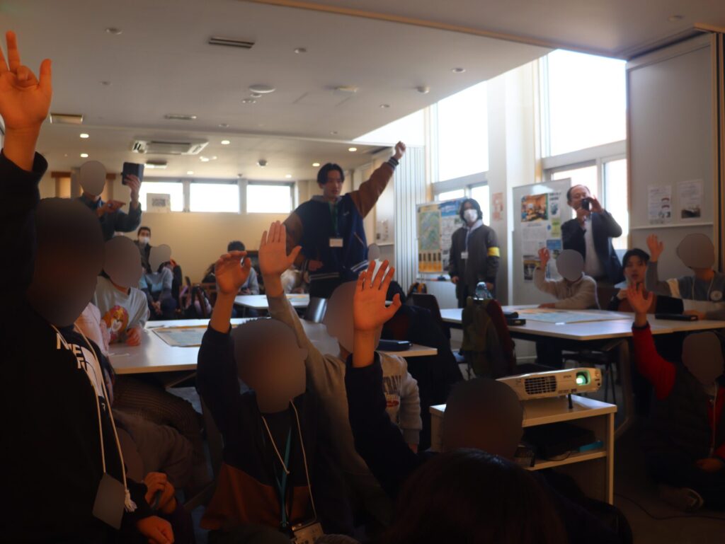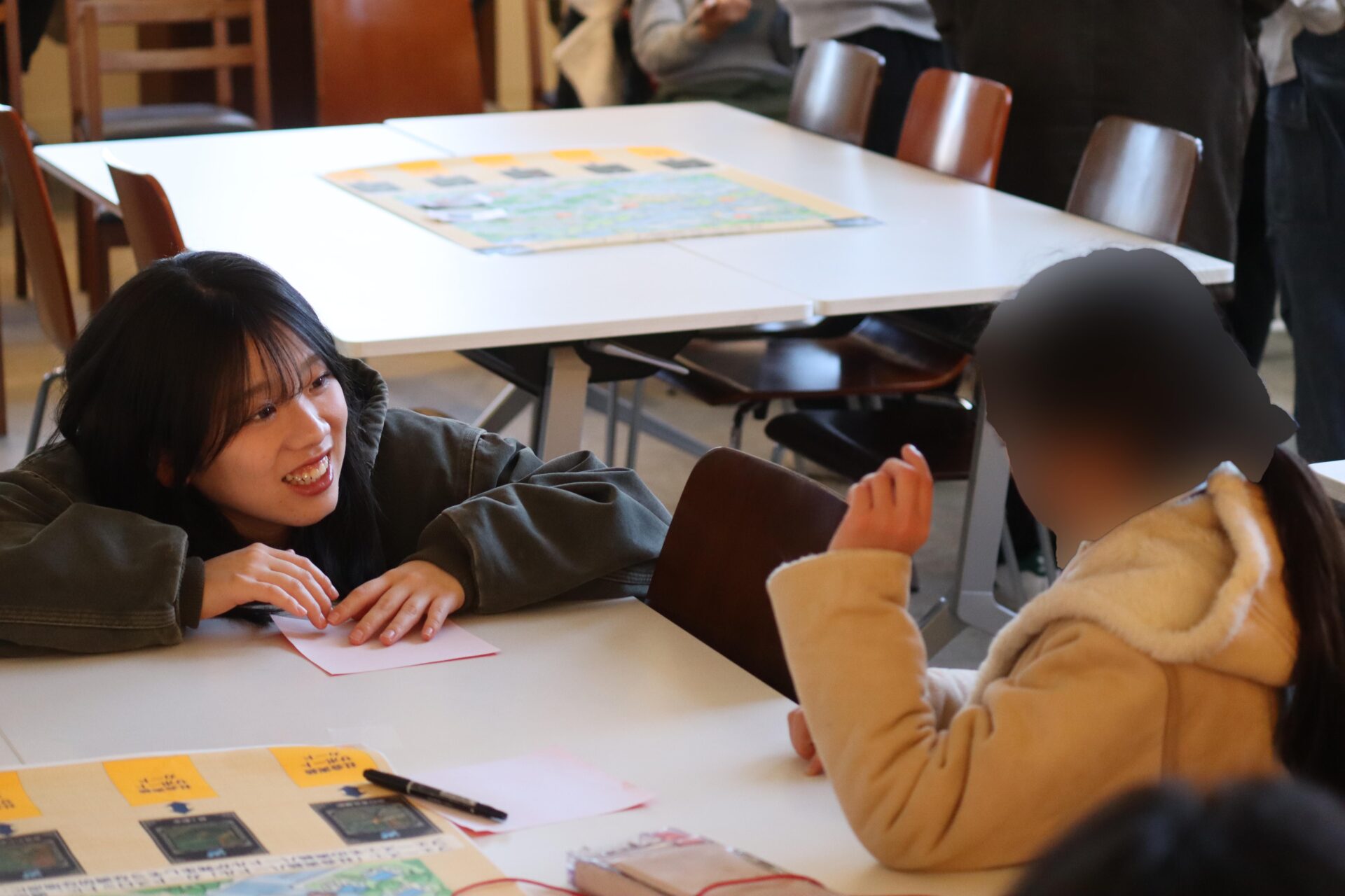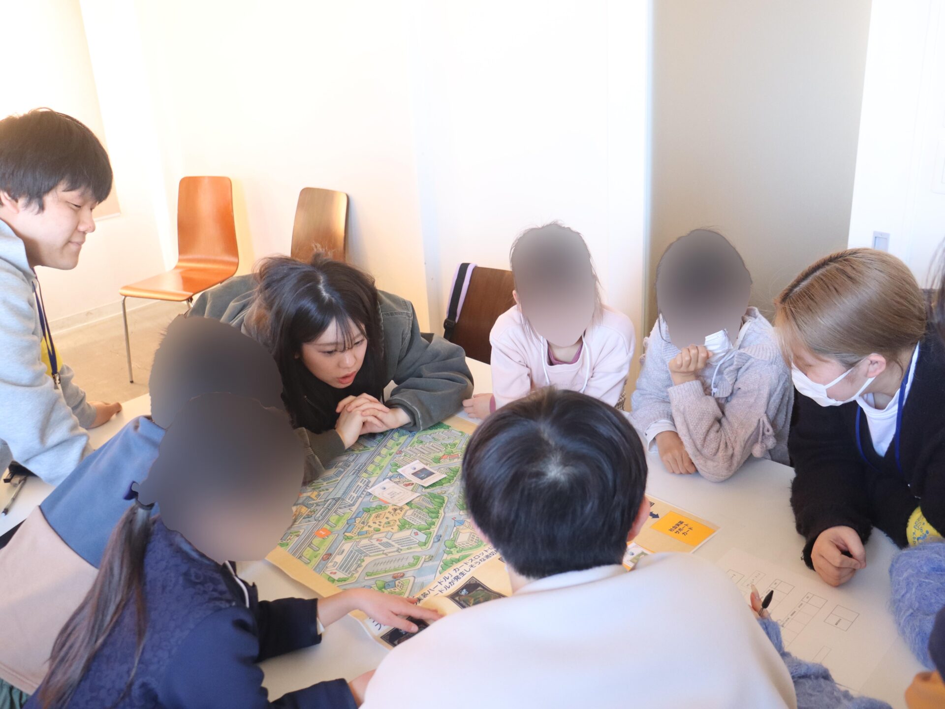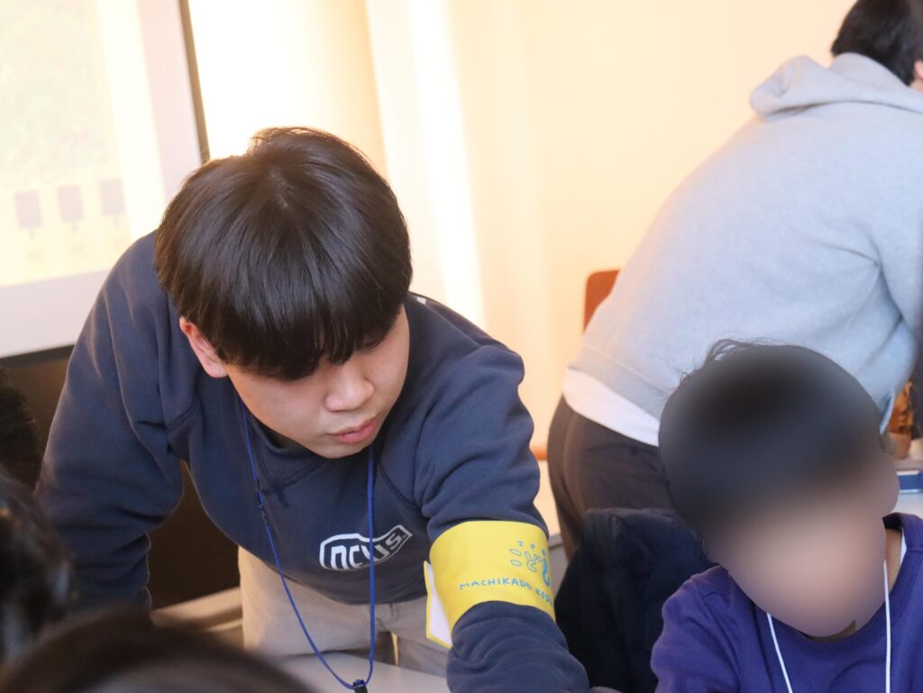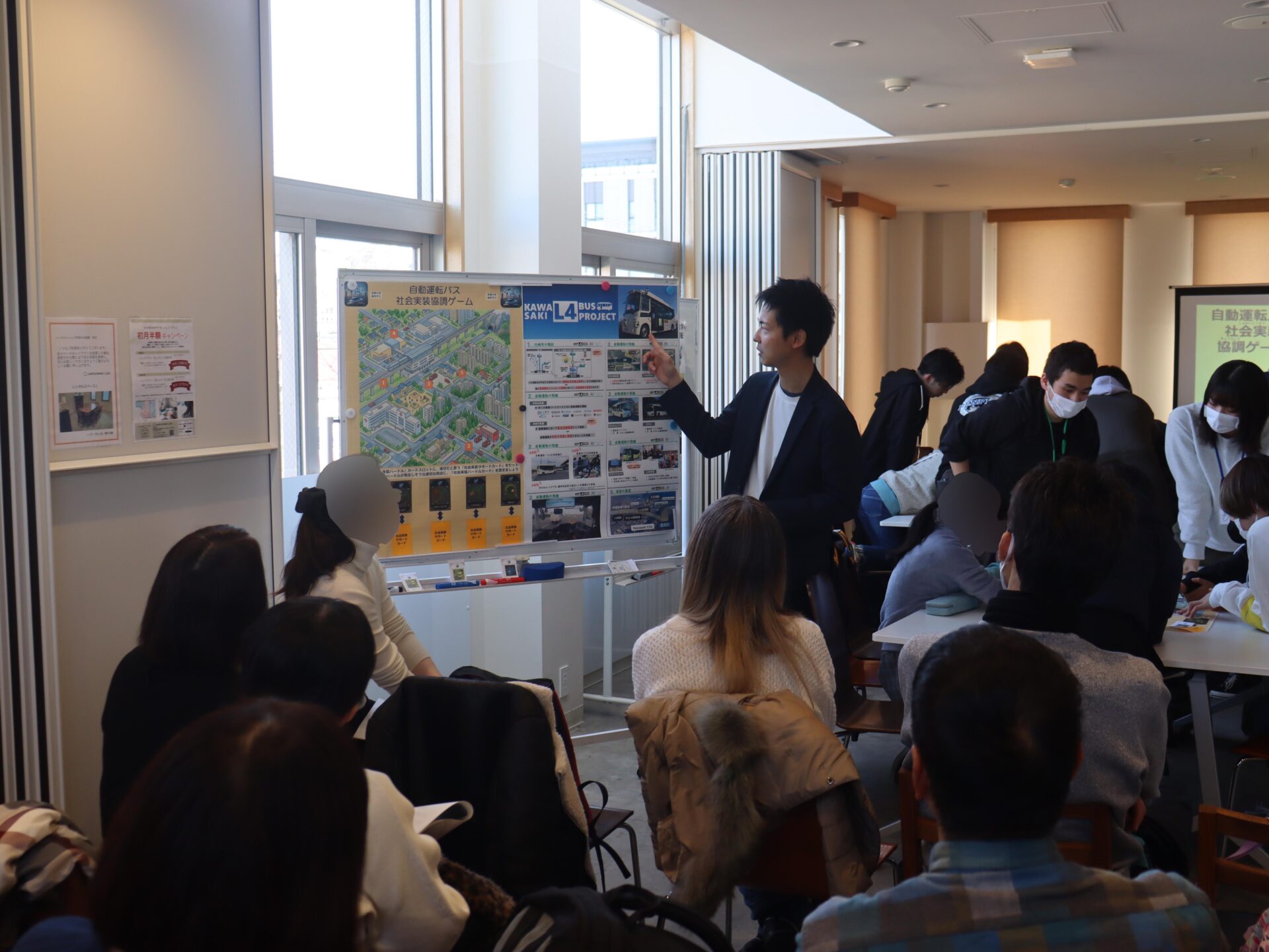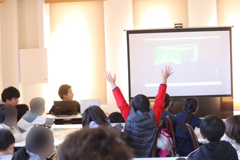 講座は午前・午後の2回、小学生1~6年生の計18名を対象に行われ、学生たちは子どもたちに、安全な運転のために必要な運転行動の要素や自動運転の定義、必要性を伝え、実際に自動運転バスの「目」であるLiDAR(ライダー)(赤外線を使って離れた場所にある物体の形状や距離を測定するセンサー)の説明と、LiDARを用いて教室内で人が動くとどのように測定されるかの実験やクイズ等を行った後、カードと地図を使った「自動運転バス社会実装協調ゲーム」を行い、子どもたちはわからないことや悩んでいることを学生たちに相談し、フォローやアドバイスを受けながら自動運転が社会で受け入れるにはどのような協力が必要かを考え、理解を深めました。