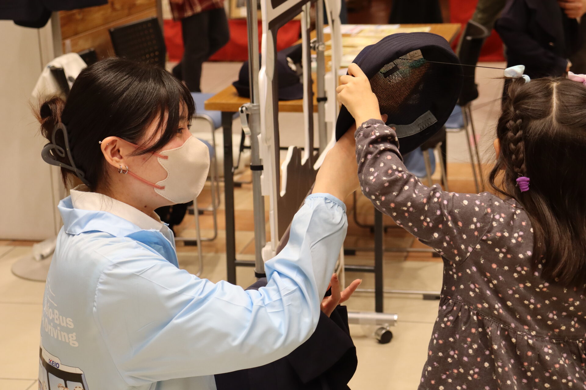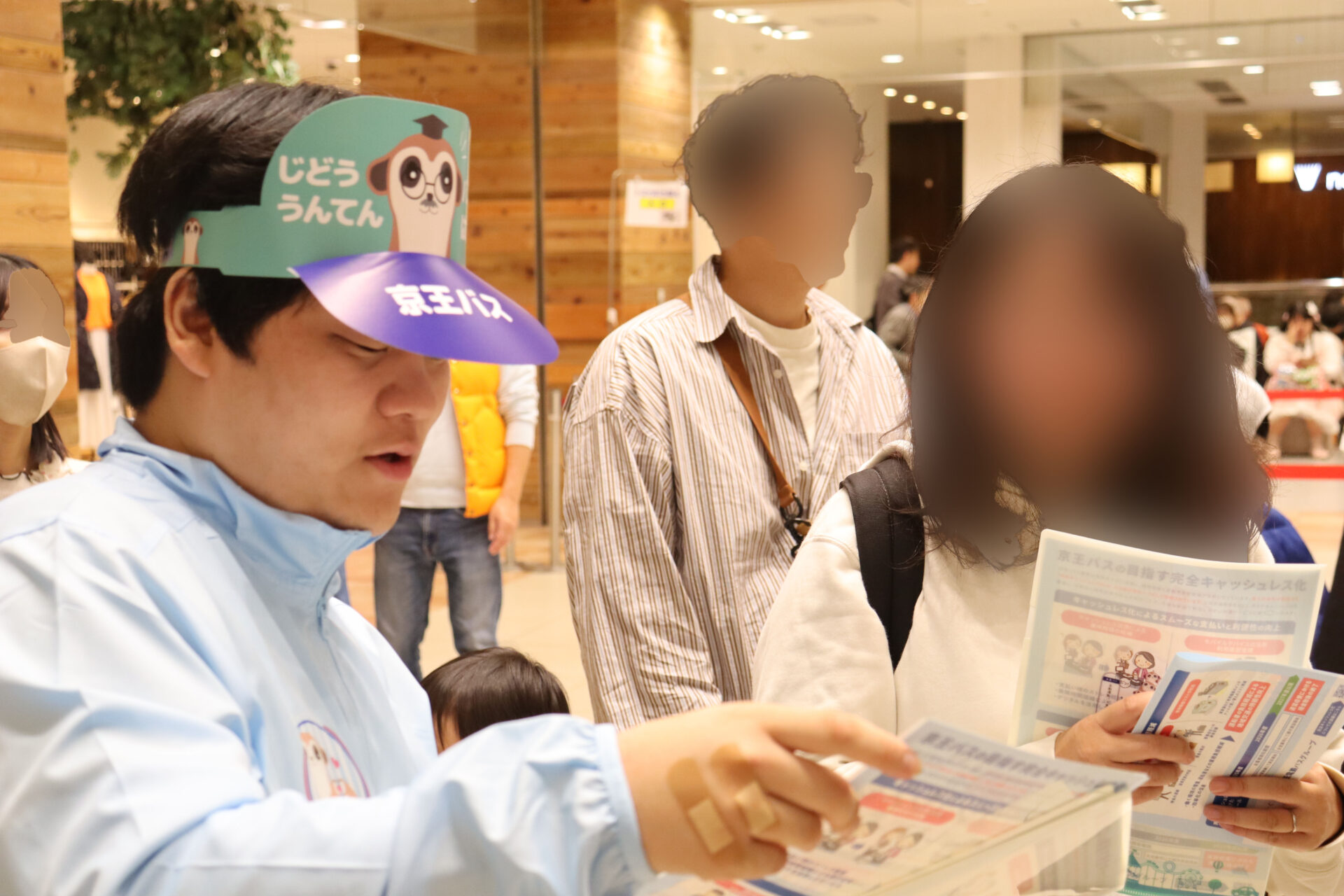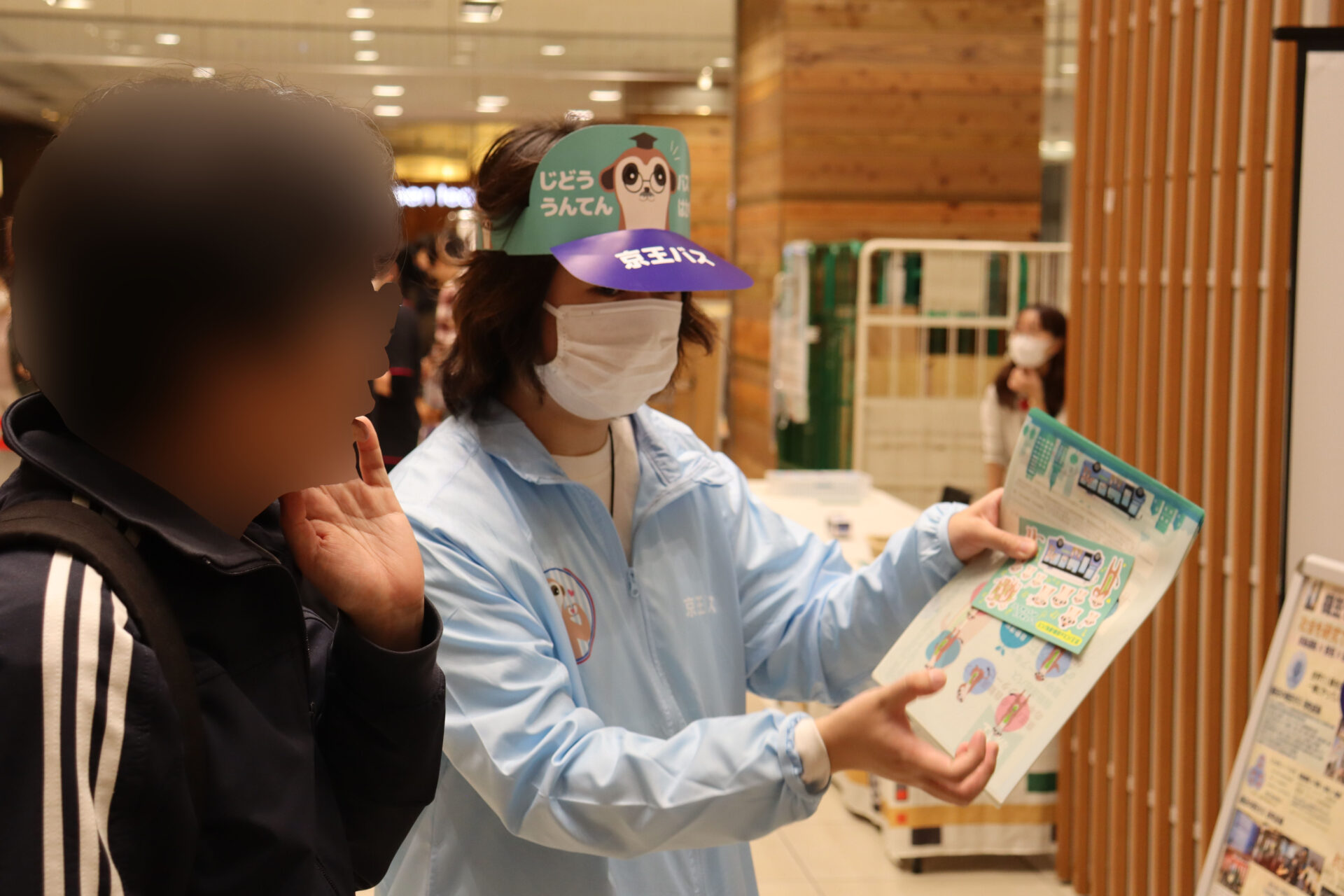 また、学生たちは京王バス株式会社と協力し、ショッピングセンターに来館された地域の方に、自動運転バスキャラクター「み~あちゃん」の就任と京王バスのキャッシュレス化に向けた告知のビラ配布を実施しながら、今冬に予定している、西新宿での自動運転実証実験(東京都の自動運転推進事業で、本学や京王バス株式会社、本学連携協定先のアイサンテクノロジー株式会社等との共同事業)の告知も行いました。その他、写真撮影コーナーを訪れたお子様連れの方へ積極的に写真撮影を申し出て交流し、イベントを盛り上げました。
