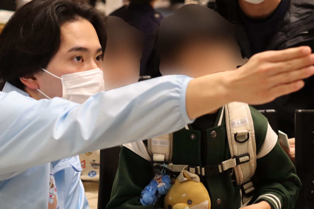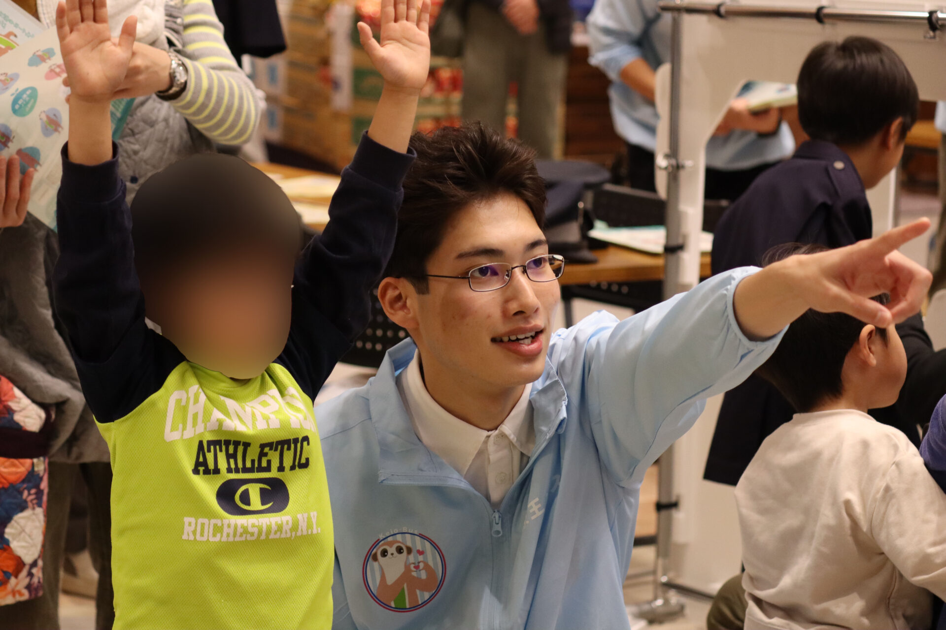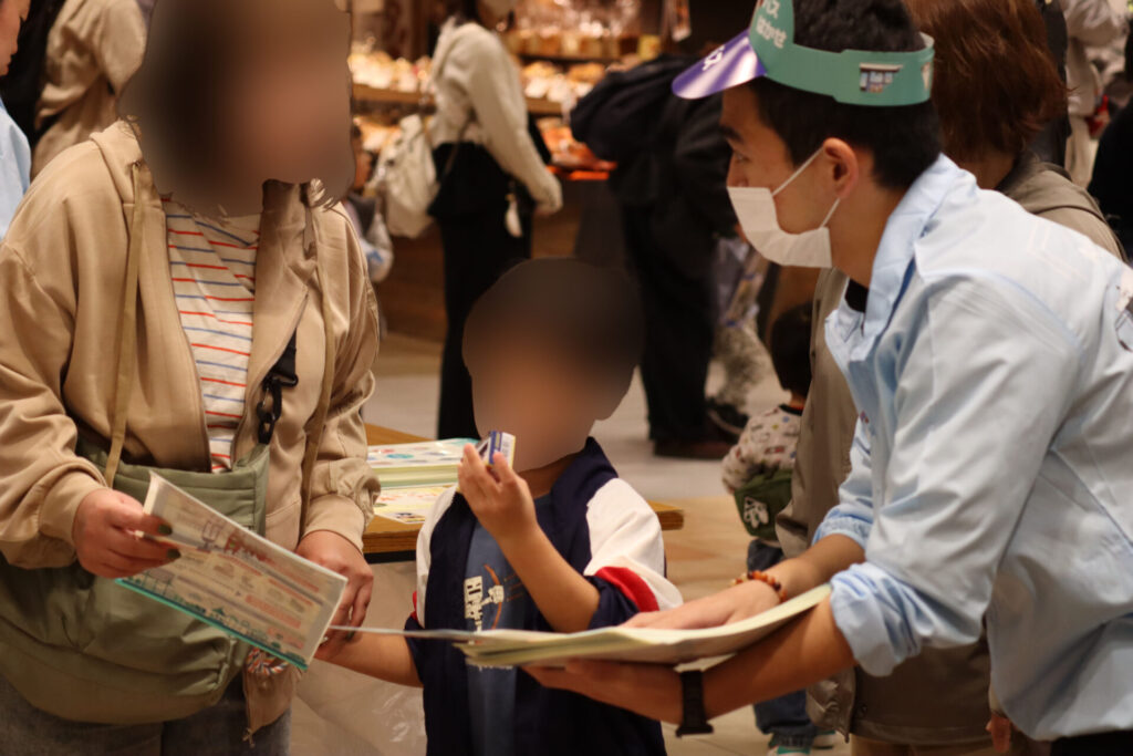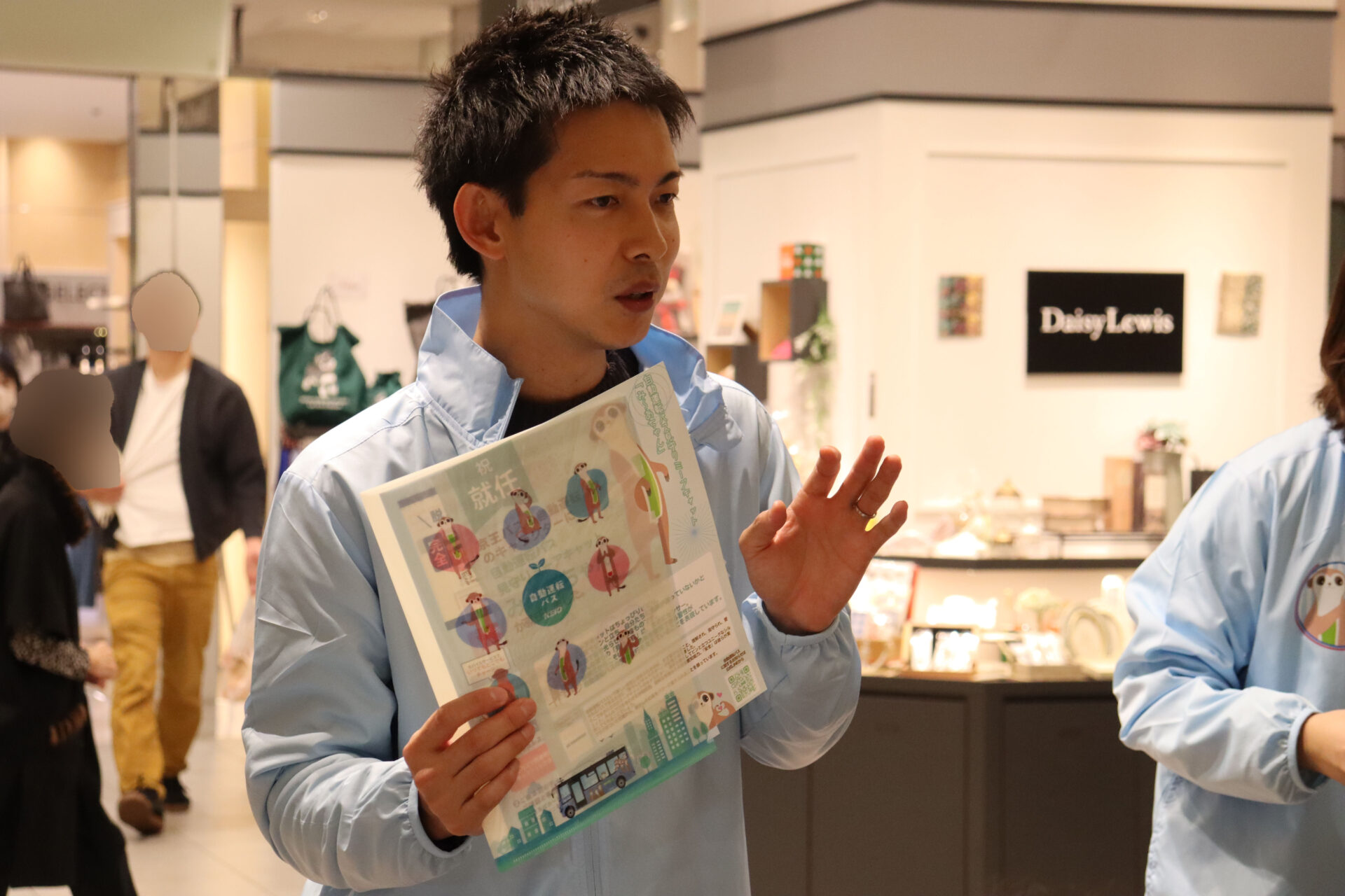 また、学生たちは京王バス株式会社と協力し、ショッピングセンターに来館された地域の方に、自動運転バスキャラクター「み~あちゃん」の就任と京王バスのキャッシュレス化に向けた告知のビラ配布を実施しながら、今冬に予定している、西新宿での自動運転実証実験(東京都の自動運転推進事業で、本学や京王バス株式会社、本学連携協定先のアイサンテクノロジー株式会社等との共同事業)の告知も行いました。その他、写真撮影コーナーを訪れたお子様連れの方へ積極的に写真撮影を申し出て交流し、イベントを盛り上げました。