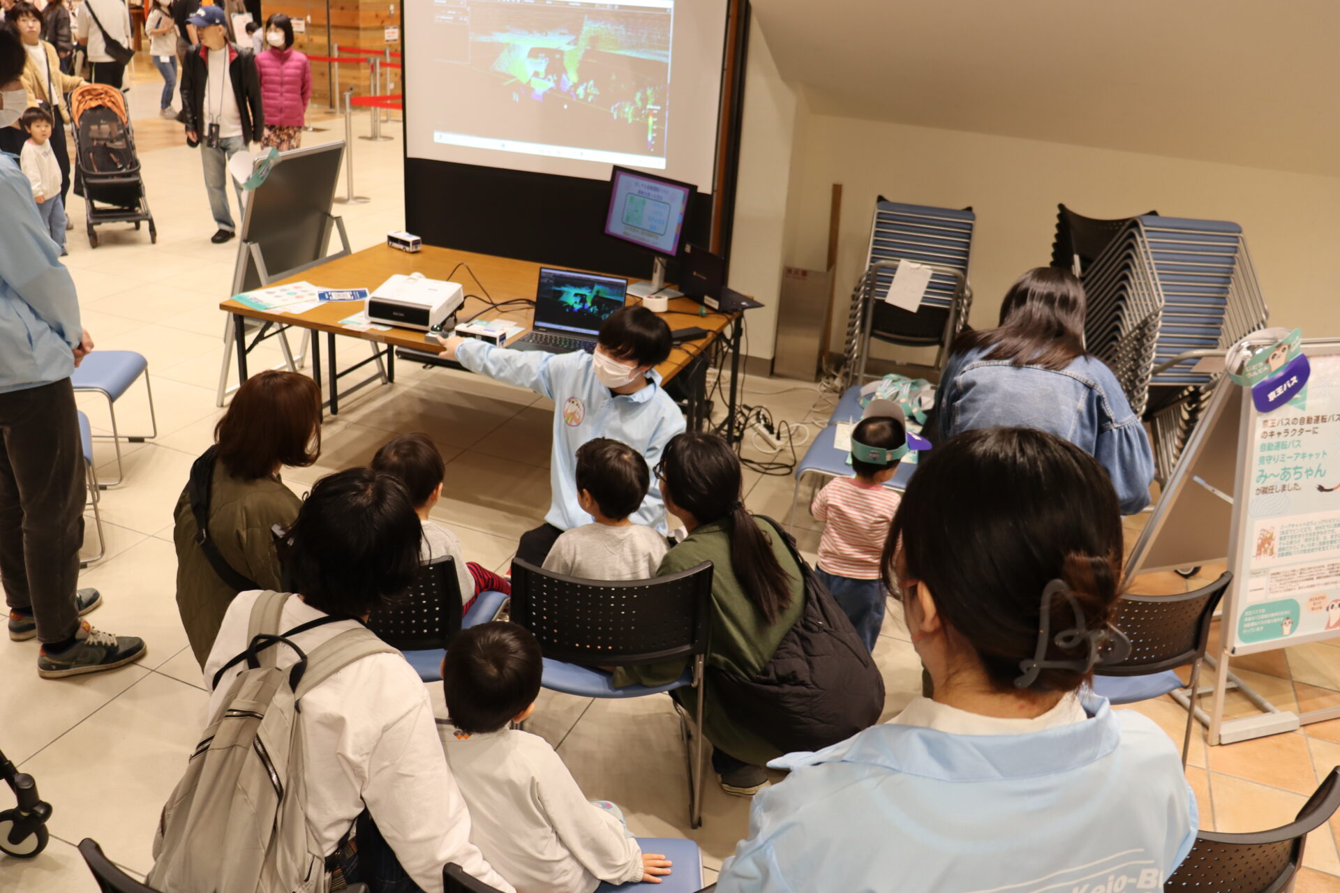 2日間で子どもたちを中心に、300名以上の老若男女がイベントを体験し、「自動運転のバスに乗ってみたい」「赤外線の反射で人がどう動いているのかがわかるのはすごい」「今度、実証実験に行ってみます」などの声をいただき、樋笠准教授も参加者や保護者に対し自動運転についての質問対応や、実装の壁となる事情等の説明を行い、自動運転への理解を深めることができました。