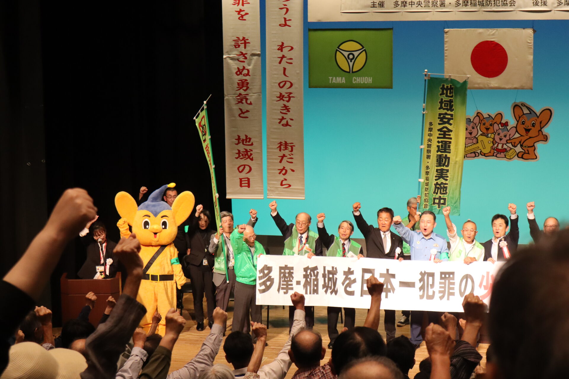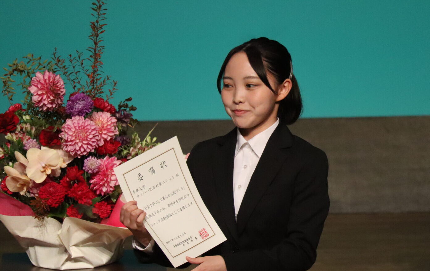 10月10日、パルテノン多摩で「多摩稲城市民防犯のつどい」が開催され、多摩稲城防犯協会から、多摩市・稲城市の防犯ボランティア活動団体に対する委嘱状が多摩大学サイバー犯罪対策ユニット(多摩CCPU)に手渡されました。
