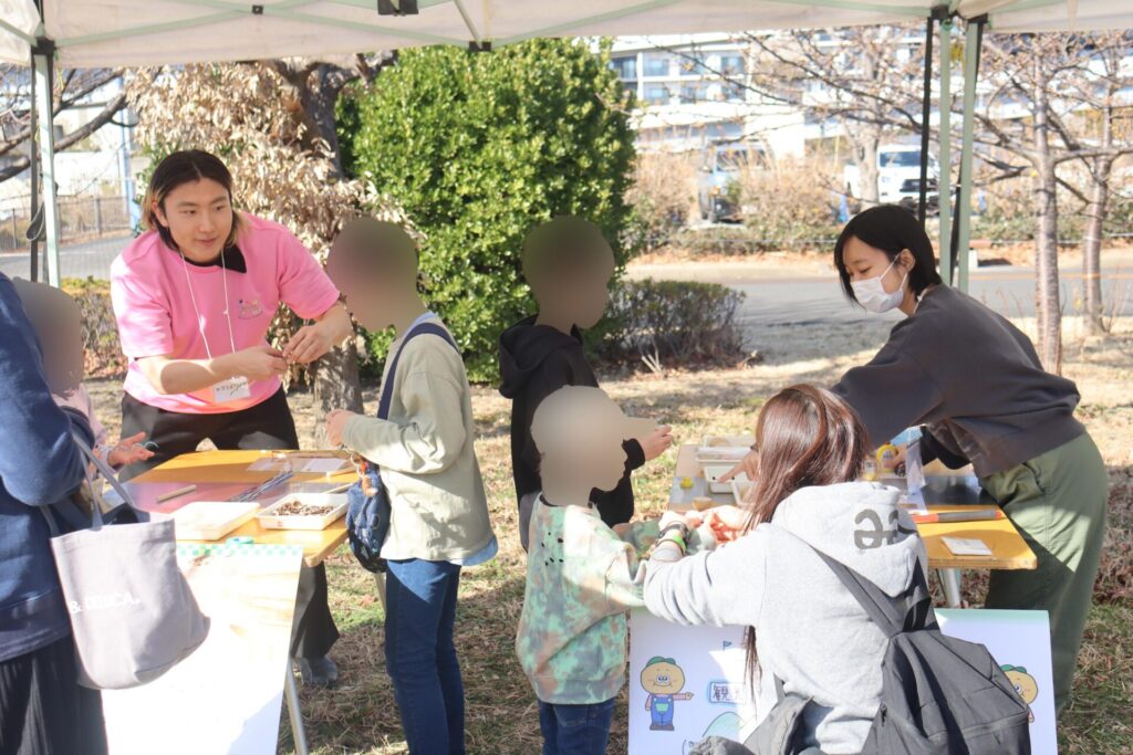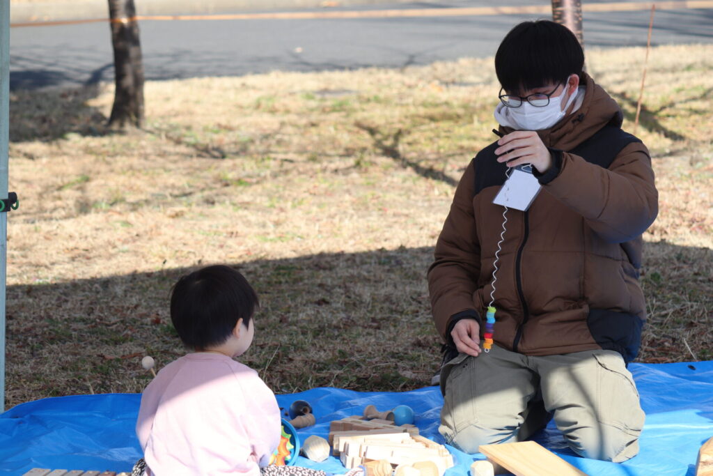 また、今回は「檜原森のおもちゃ美術館」の協力をいただき、「木のおもちゃ体験」も併せて実施しました。学生たちは子どもたちと一緒に遊び、ふだんとは違った木の温もり、優しさが感じられるおもちゃの楽しさを伝え、たくさんの子どもたちと触れ合いました。子どもだけでなく大人も木のおもちゃで遊んだりと、来場された老若男女の憩いと遊びの場となっていました。