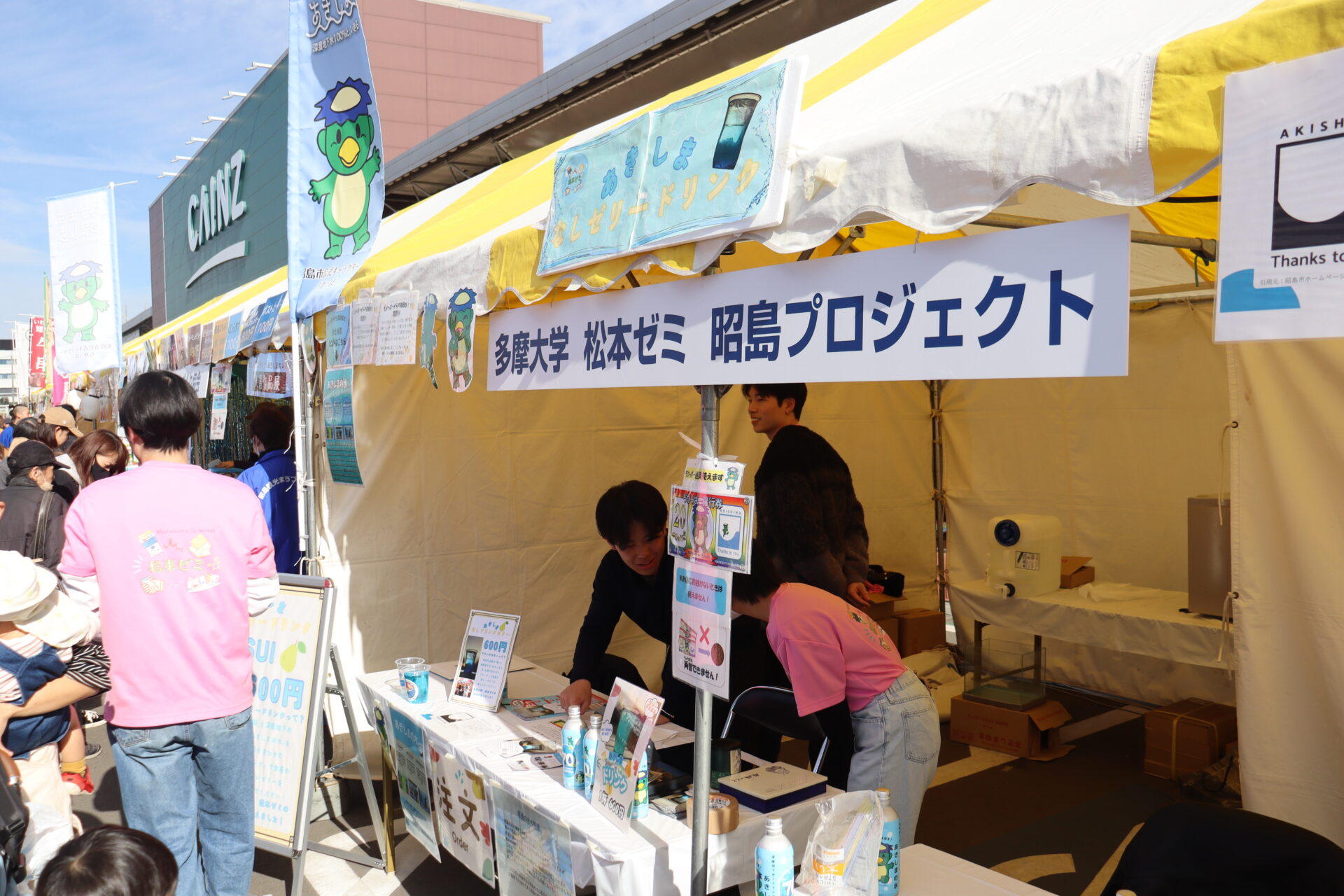 11月23日、24日、経営情報学部 松本祐一ゼミ(計14名)が東京都昭島市カインズ昭島周辺 特設会場で開催された第55回昭島市産業まつりに参加し、昭島の水をプロデュースした「なしゼリードリンク」を販売しました。