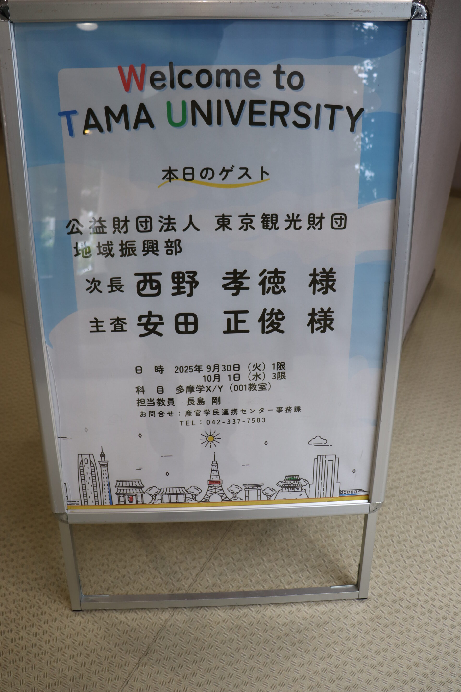 9月30日、10月1日、「多摩学」*の授業にゲスト講師として公益財団法人東京観光財団地域振興部 次長 西野 孝徳氏、主査 安田 正俊氏を迎え、多摩地域の観光業をテーマに、学生向け「スタディツアー」課題の基礎理解とアイデア創出に資する情報共有についてご講演をいただきました。