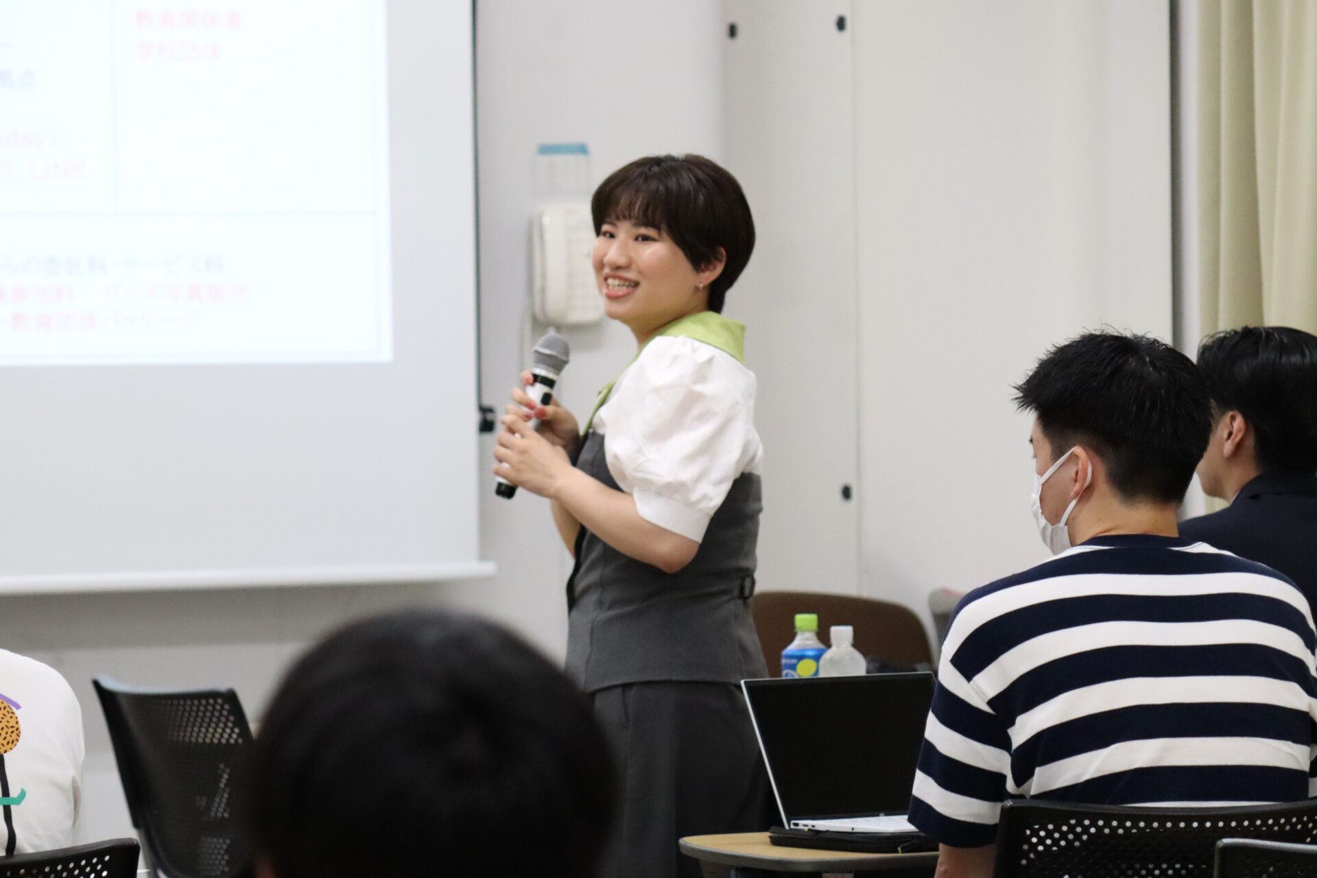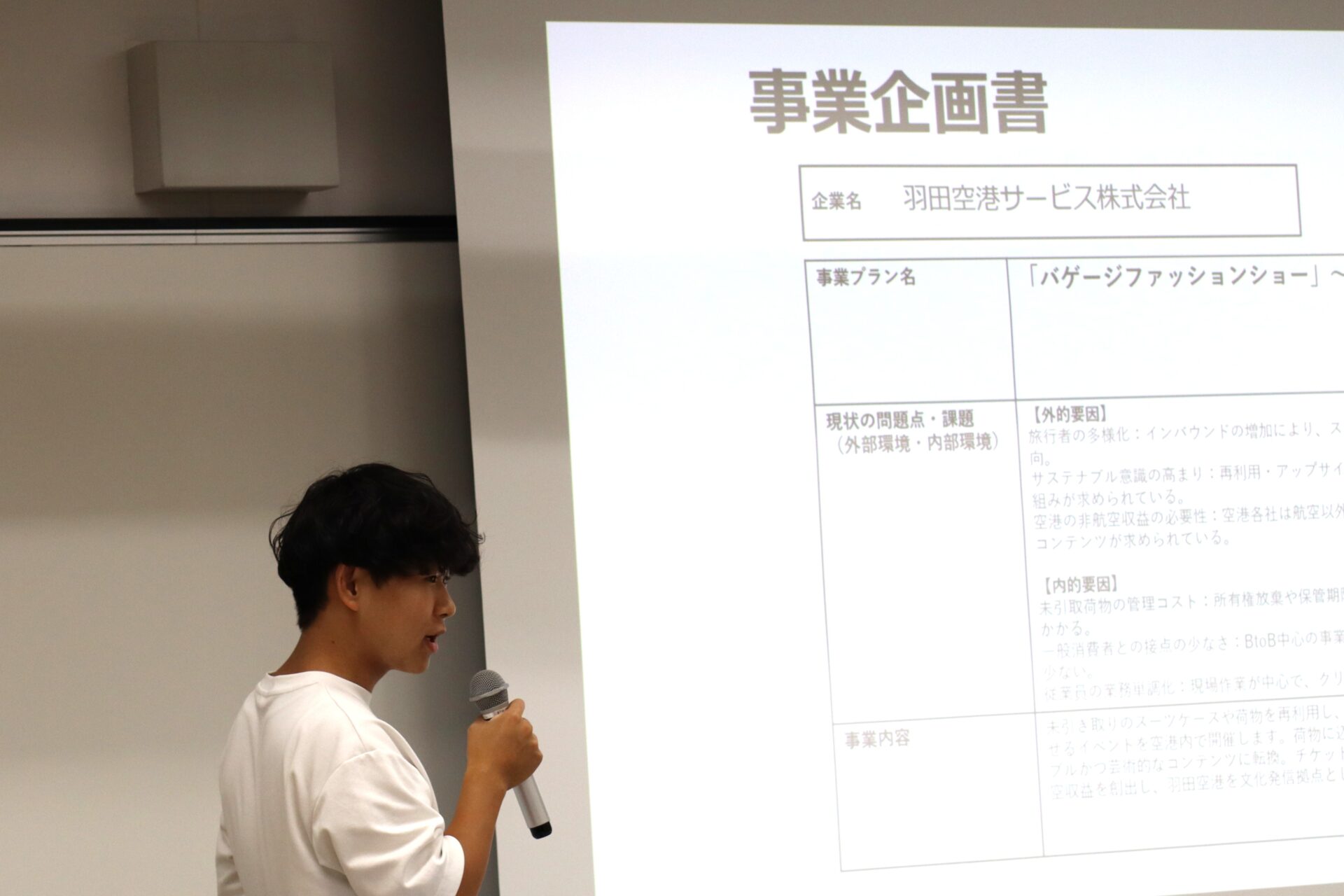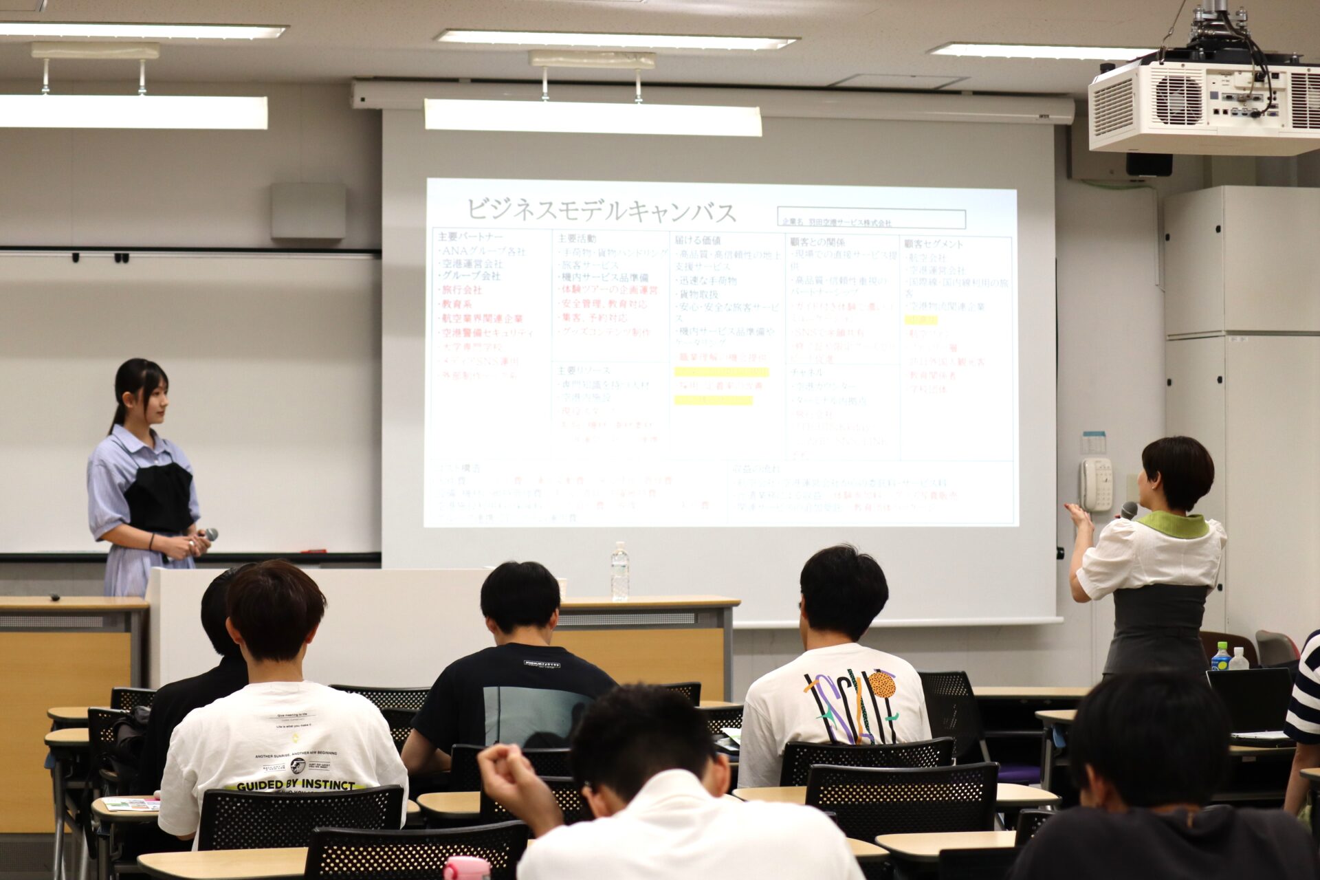 7月24日に実施された最終プレゼンテーションでは、授業の集大成として学生たちが提出した事業企画案の中から特に優れた11案を発表。羽田空港サービスグループ様からも人財戦略部より次長の前川俊也様、サブチーフの赤堀直孝様と川元日菜子様の3名をお招きし、ビジネスモデルキャンバスとピクト図を用いた発表が行われました。