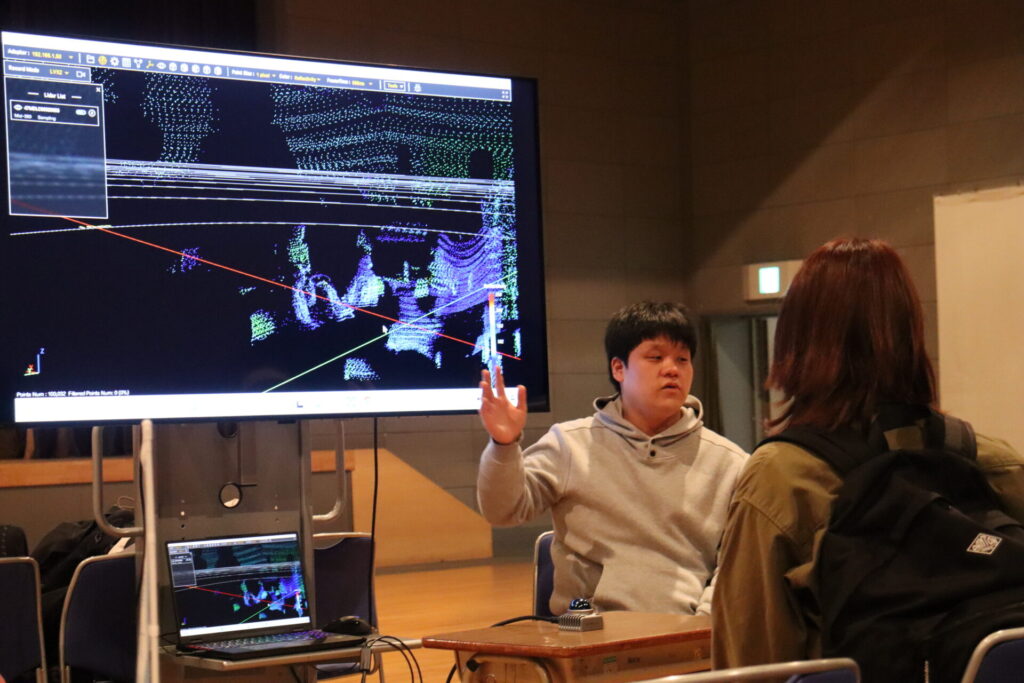 今回のイベントでは、実際に自動運転バスにも搭載されているLiDAR(「Light Detection And Ranging(光による検知と測距)」の略。その基本的な仕組みは、レーザー光を対象物に向けて照射し、その反射光がセンサーに戻ってくる時間をもとに距離を測定するというもの)を使い、センサーが感知した学生の動きを、映し出されたモニターで当てるゲームや、実際にLiDARを使用している自動運転バスの説明を行いました。