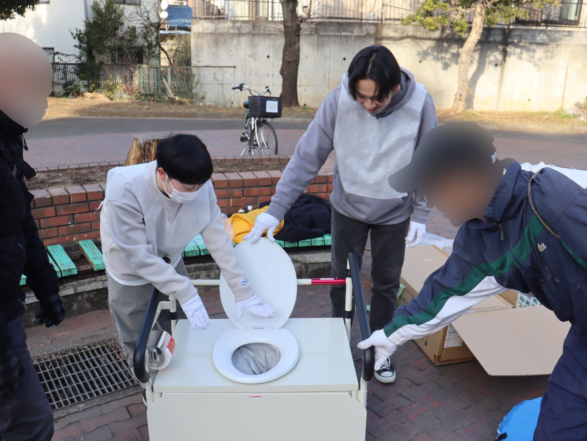 学校の施設(教室や体育館など)を避難者用として使用し開設するための準備や、防災倉庫道具の展示など、避難所の開設に必要な訓練が行われ、学生たちは多摩市職員・自治会など地域の方々とともに避難所の設置を行うとともに、災害対策用トイレを実際に設営し、訓練に参加した方に向けて説明を行いました。